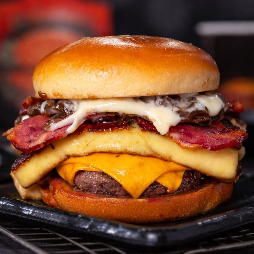 Pão brioche, bife 200g, cheddar fatia, queijo coalho grelhado e banhado no mel, cebola caramelizada, bacon crispy, e maionese de alho.