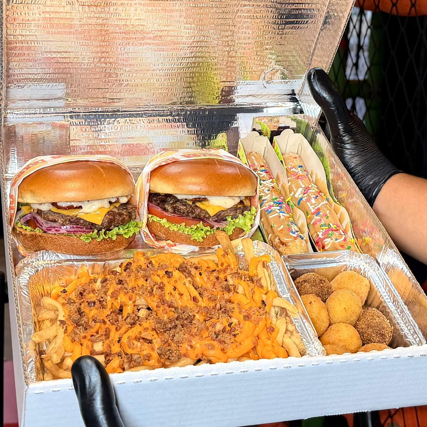 2 Burgers gourmets: Pão brioche, bife 100g, cheddar fatia, cebola roxa, maionese de bacon , alface e tomate + Fritas cheddar e bacon + Salgadinhos + 2 Churros Tradicional.